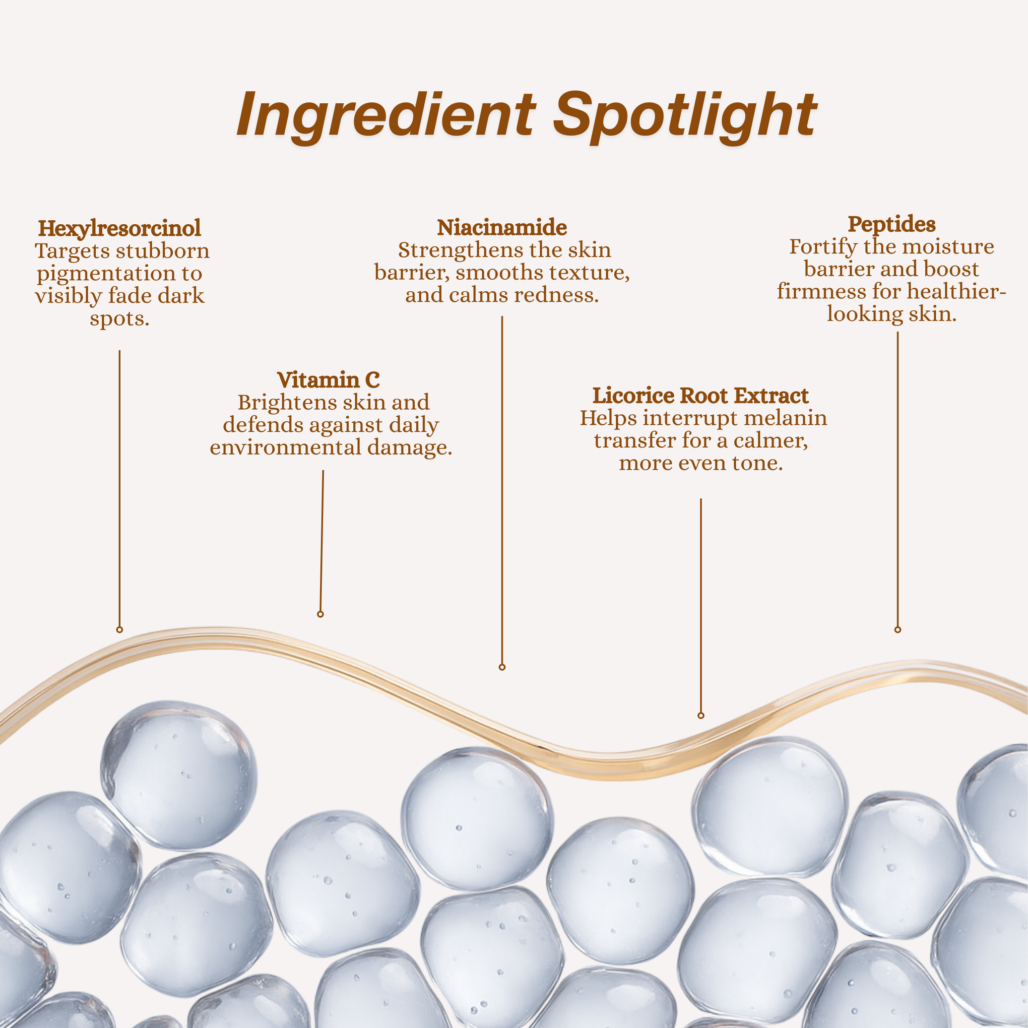 If you've struggled with dark spots or uneven tone, you've probably heard of hydroquinone — a powerful but often harsh ingredient. That's why we chose Hexylresorcinol, a gentle yet highly effective alternative backed by science.